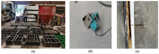 All specimens were produced with wooden formwork. After concrete pouring, they were covered with a polyethylene sheet and cured for 28 days under standard curing conditions (at a temperature of 22 °C and a relative humidity of 95%). At the time of testing, the specimens were 30~60 days old. Figure 2a shows a photo of the specimen preparation during the concrete pouring.