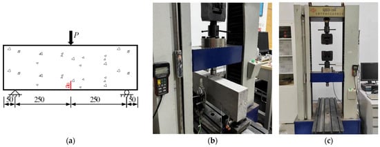 The fracture test was conducted with a QBD-100 electro-hydraulic servo-controlled universal testing machine in the Engineering Mechanics Laboratory at the Beijing University of Technology. The testing machine, manufactured by Changchun Qianbang Testing Equipment Co., Ltd. (Changchun, China), has a maximum load capacity of 100 kN, as shown in Figure 3c. The loading is under displacement control, with the main transverse beam vertical movement of 0.02 mm/min. An X-Y recorder automatically recorded vertical load and transverse beam displacement.
