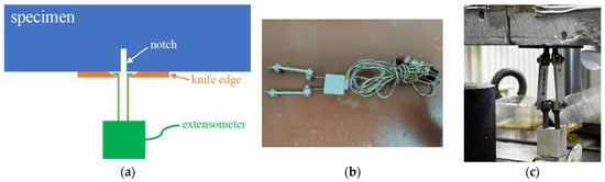 Arrangement of extensometer gauge: (a) Scheme of CMOD measurement; (b) Photo of the extensometer; (c) Photo of mounted extensometer.