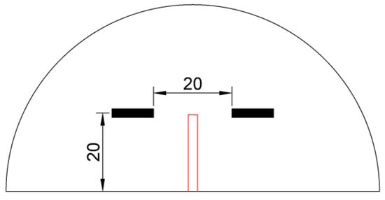 Resistance strain gauges were also mounted on the side surface of the specimen to monitor longitudinal strain variation in the notch tip strain field during loading. The cracking load corresponding to the initiation of concrete cracks can be determined by using reduced strain measurement. This reduction is because energy release associated with concrete cracking stops the strain value outside the crack path from increasing. Vertically, the centerline of the two strain gauges coincides with the prefabricated notch tip [37]. Longitudinally, they are symmetrical about the prefabricated notch and its extension line at 20 mm spacing. All strain gauges have a gauge length of 10 mm, width of 2 mm, and electrical resistance of 120 Ω, and the strain values were recorded with the UCS60B static data collection system. The arrangement of strain gauges for cracking load measurement is illustrated in Figure 5.