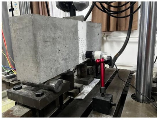All specimens were tested under a three-point bending condition and had a span-to-height ratio S/H of 2.5, as shown schematically in Figure 3a. A total of 28 specimens from the PC series and 6 specimens from the RC series were tested by a static loading test machine, as shown in Figure 3b.