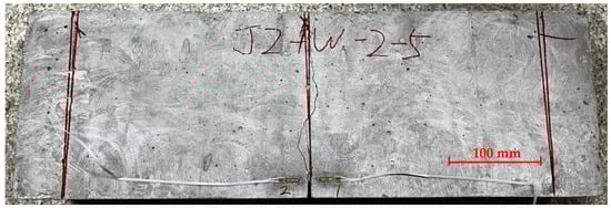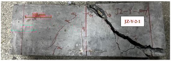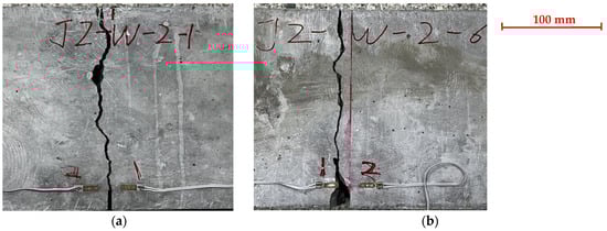 The cracking load beyond which cracks would initiate from the prefabricated notch tip and start to grow is determined by strain gauges affixed on both sides of the prefabricated notch. A typical strain measurement of the plain concrete specimen with a notch-to-height ratio of 0.1 is shown in Figure 12, along with a photo of the fractured specimen in Figure 13. The cracking load was determined when strain measurement stopped increasing in the load versus strain plot [42]. As seen from Figure 12a, both strain gauges in specimen JZ-W-2-1 showed reduced strain values. However, only Gauge 2 showed effective strain measurement in specimen JZ-W-2-6 as the crack grew past the location where Gauge 1 was affixed, and the strain gauge was damaged. The measured cracking load for the two specimens is 15 kN and 22.5 kN, respectively.
