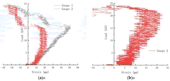 Strain measurement for determining the cracking load of plain concrete specimens at α0 = 0.1: (a) JZ-W-2-1; (b) JZ-W-2-6. Gauge 1 in JZ-W-2-6 was damaged.