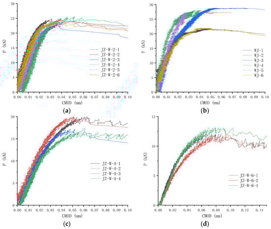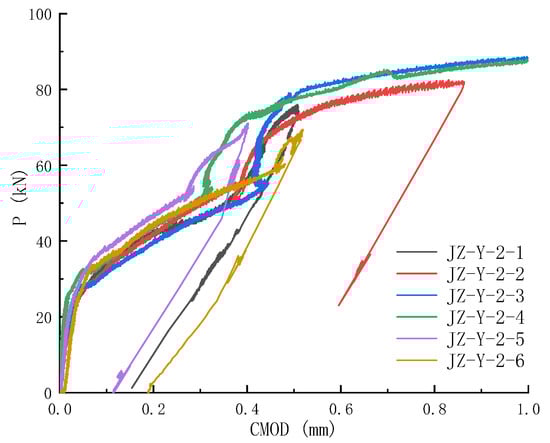 Load versus crack mouth opening displacement curves for PC specimens with various notch-to-height ratios are shown in Figure 14. Since no appropriate unloading devices were provided for the testing machine, the PC specimens always broke abruptly after reaching the maximum load-carrying capacity, and the measured CMOD data afterward were distorted. Therefore, Figure 14 only shows part of the P-CMOD curves during the loading stage up to the peak load Pu. The initial straight line of load versus displacement curve demonstrates linear elastic response. As the crack initiates and propagates, the CMOD develops faster than the load, and the P-CMOD curve deviates.