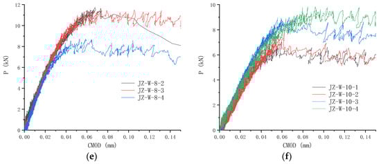Measured cracking load for specimens of various notch-to-height ratios were summarized in Table 4. Because both strain gauges in specimens JZ-W-6-3 and JZ-W-8-1 were damaged during the three-pointing bending fracture test, these specimens were omitted from the table. The averaged cracking load of plain concrete specimens is 17.0 kN, 12.4 kN, 6.6 kN, 7.6 kN, and 5.3 kN with a coefficient of variation of 0.33, 0.27, 0.14, 0.26, 0.33 for notch-to-height ratios of 0.1, 0.2, 0.3, 0.4, 0.5, respectively. Generally, the cracking load decreased as the notch-to-height ratio increased.