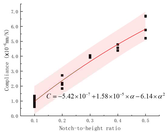 It is recognized that a stable crack propagation stage exists before the unstable fracture of concrete. Therefore, the actual crack size before the specimen’s unstable fracture is slightly larger than the prefabricated notch length a0. If the amount of stable crack propagation before unstable fracture, also the fictitious crack extension, is termed ∆afic, then the equivalent crack size ac just before the onset of unstable fracture equals a0 + ∆afic. However, precise measurement of ∆afic during the experiment is complex and requires advanced measuring techniques [31]. The principle of linear asymptotic superposition has been proposed to calculate ac [30], and can be calculated directly from peak load and the corresponding crack mouth opening displacement, eliminating the need for unloading at peak load [31,38]. For the three-point bending beam specimens with a span-to-height ratio of 2.5, the equivalent crack size ac when the applied load reaches its peak value of Pu can be determined by Equations (1) and (2) as [31]: