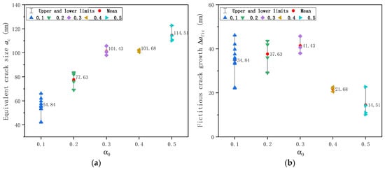 (3) Both and , indicative of crack initiation and unstable crack propagation, can be determined by DKFM. The equivalent crack size value of 107 mm agrees with experimental observation. The average value, standard deviation, and coefficient of variation of of 20 specimens determined by DKFM are 0.78 , 0.22 , and 0.29, and those of from 26 specimens are 1.94 , 0.28 , and 0.14, respectively.