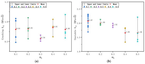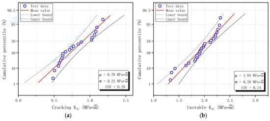 The average value, standard deviation, and coefficient of variation of unstable fracture toughness determined by DKFM are 1.94 , 0.28 , and 0.14, respectively, as shown in Table 6 in Section 3.6. Based on the identical 26 specimens, the average value, standard deviation, and coefficient of variation of fracture toughness KIC determined by BEM are 2.11 , 0.30 , and 0.14, respectively. This comparison demonstrates that the results from the two methods are comparable: the two sets of results have the same coefficient of variation, and average values are different by less than 10% (to be specific, 8.1%). Given the extensive scatter nature inherent in concrete material properties [39,40], these are considered acceptable for engineering applications.
