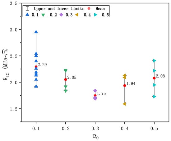 The specimens from this study have the exact cross-section dimensions and span-height ratio S/H as those from the literature [29,31] but were made from concrete of different strength grades. The equivalent fracture toughness of C30 from 13 specimens is 2.37 [29]. As the cubic compressive strength increases, it was found that its fracture toughness decreases slightly. A 45.3~47.8% increase in strength leads to a 7.6~11.4% decrease in fracture toughness. This observation underscores the concept of fracture toughness as a quantity affected by the combined influence of strength and ductility. Technological upgrades have produced modern concrete with higher strength. However, this increase in strength is often accompanied by a decrease in ductility. If an increase in strength does not entirely compensate for the decrease in ductility, the resultant fracture toughness will decrease. Therefore, in practical engineering, close attention should be paid to the ability of higher-strength ordinary concrete to resist unstable fractures.