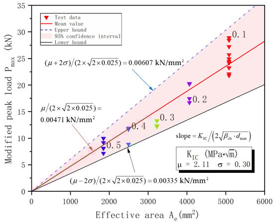 where Pu is the measured peak load and W is the self-weight of the specimen between supports; Pmax is, therefore, the modified peak load considering the effect of specimen self-weight. The cracking fracture toughness can also be obtained from Equations (4) and (5) by replacing Pu with Pini, ac with a0, and αc with α0.