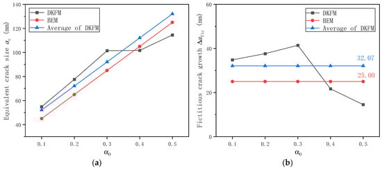 Comparison of calculated crack size for plain concrete specimens based on DKFM and BEM: (a) Equivalent crack size ac just before the onset of unstable fracture; (b) Fictitious crack extension ∆afic.