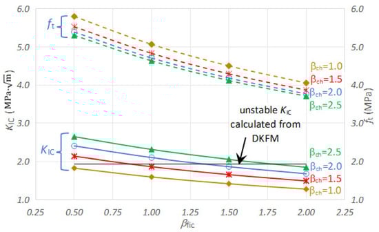 Figure 26 shows the variation in mean value from Table 9 graphically, the dotted lines for ft and solid lines for KIC. At a given βch, ft and KIC decrease with the increase of βfic. The decrease rate in ft and KIC tends to slow down as βfic increases. For example, for βch = 2.0, the decrease in ft and KIC is 12.5% when βfic increases from 0.5 to 1.0; when βfic increases from 1.5 to 2.0, the decrease in ft and KIC is around 9.8%. This tendency could be explained as follows. As βfic increases, the fictitious crack growth length before fracture increases, indicating that the material is more susceptible to fracture, resulting in a decrease in ft and KIC.