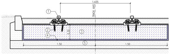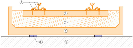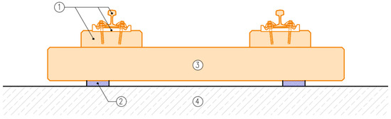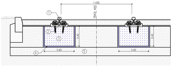 - Type 2—structure with discrete supports and discrete fastening of the rail to the floating slab system in the form of longitudinal concrete beams (Figure 24).