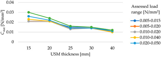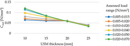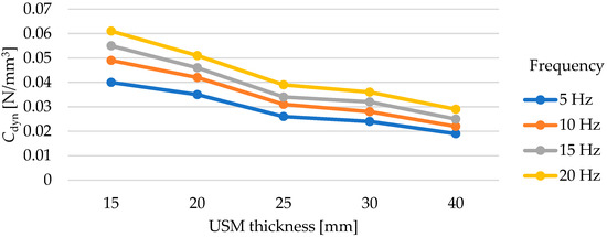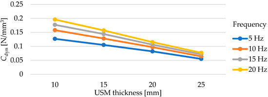 - Increase of the USM thickness (in mats with the same density and the same way of space filling) results in decreasing values of the static and dynamic bedding moduli—the static bedding modulus decreases by 38–72% (depending on the assessed load range) when the mat thickness changes from 10 mm to 25 mm, and the dynamic bedding modulus decreases by 57–60% (depending on the load frequency);