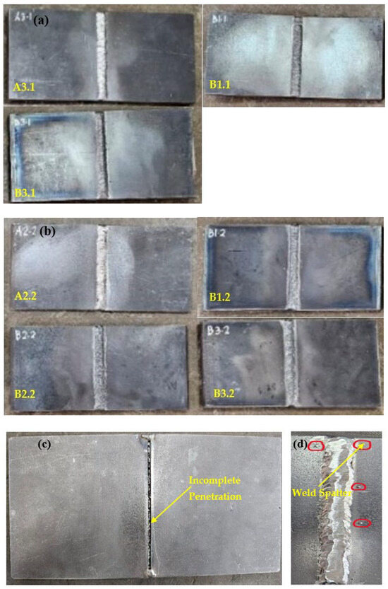 (a) Specimens A3.1, B1.1, and B3.1 (b) Specimens A2.2, B1.2, B2.2, and B3.2 (c) Incomplete penetration (specimen A3.1) (d) Weld spatter (Specimen A2.2).