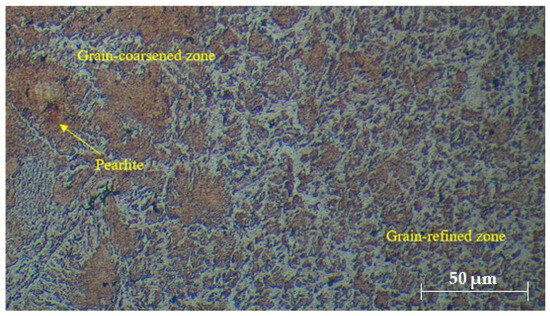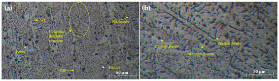 The microstructural evaluation of the welded joints, as shown in Figure 2, Figure 3 and Figure 4, provides insightful details about the grain structures and microstructural features resulting from different filler materials. Figure 2 reveals the grain structures in the upper part of the HAZ, distinguishing the grain-coarsened zone with larger grains due to high welding temperatures, the pearlite region indicating slower cooling, and the grain-refined zone with smaller grains formed through recrystallization. In Figure 3, the FZ microstructure is depicted for welds using ER70S-6 and ER308LSi fillers. The ER70S-6 filler shows a columnar dendritic structure, martensite, bainite, and some porosity, with a some small number of specific morphologies of ferrite such as Widemänstatten ferrite (WF) and grain boundary ferrite (GBF) also found in the FZ, aligning with the microstructure results obtained by Khamari et al. [23]. In contrast, the ER308LSi filler exhibits granular ferrite, skeletal ferrite, and an austenite matrix, each phase contributing to the weld’s mechanical properties. Two morphological structures, granular ferrite and skeletal ferrite, are seen to be equally distributed all over the center of the FZ. These structures are categorized under types of -ferrite. -ferrite can be brought to room temperature after a cooling process due to the high percentage of nickel and chromium content in the ER308LSi filler [24]. Figure 4 focuses on the HAZ microstructure, highlighting features such as epitaxial growth and acicular ferrite structure (AFS) in welds with the ER70S-6 filler and typical austenitic phases with the ER308LSi filler. These micrographs collectively demonstrate the distinct microstructural characteristics imparted by different welding conditions and filler materials, underscoring their influence on the welded joints’ overall properties.