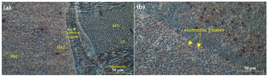 Microstructure of FZ welded with (a) ER70S-6 (b) ER308LSi filler.