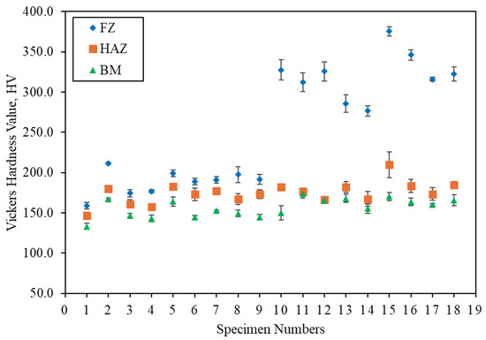 Figure 7 shows the graph of Vickers hardness at the FZ, HAZ, and BM for all the specimens. Specimens numbered 1 to 9 correspond to those labeled A1.1 to A3.3, and specimens numbered 10 to 18 correspond to those labeled B1.1 to B3.3. A consistent trend is observed among the FZ, HAZ, and BM, where the hardness of the FZ is higher than that of the HAZ, and the hardness of the HAZ is higher than that of the BM, as shown in Figure 7. This observation aligns with the findings of Gandhe et al. [8]. According to research by Opiela et al., fine grains in the microstructure result in higher hardness values compared to coarse grains [25]. In the microstructural evaluation section, it was mentioned that the grain size becomes more refined and compact moving from the center cross-section of the BM to the direction of the HAZ and FZ. Thus, the results are validated by the obtained hardness values.