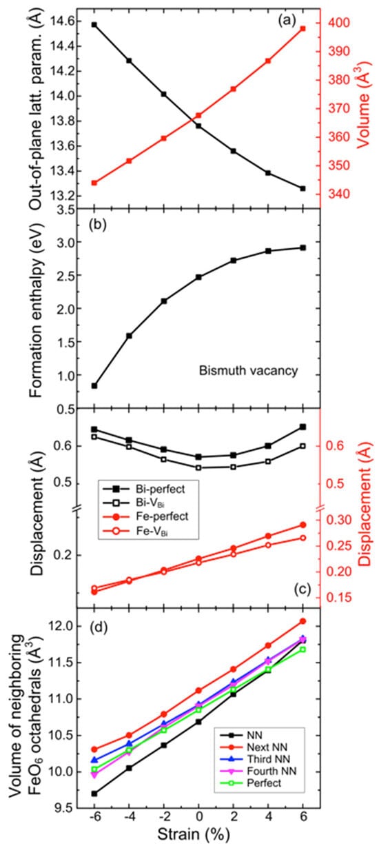 Figure 2. (a) Out-of-plane lattice parameter and primitive unit cell volume of BiFeO3 under (111) epitaxial strain. (b) Formation enthalpy of a Bi vacancy (VBi), (c) polar out-of-plane displacements of Bi and Fe from their centrosymmetric reference positions for stoichiometric and Bi deficient cells, and (d) polyhedral volumes for the FeO6 octahedra surrounding the VBi as a function of (111) epitaxial strain.