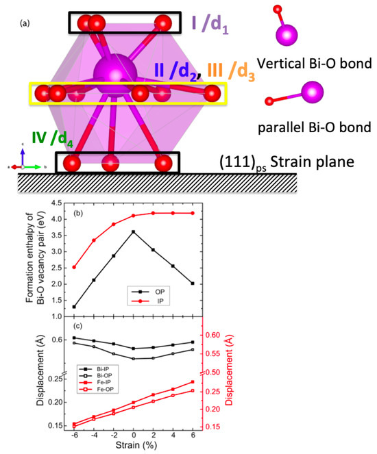 Here, we investigated four types of Bi-O vacancy pairs, depending on their relative orientations to the strain plane as well as the distance between the two missing atoms. The different vacancy pairs are illustrated in Figure 3a. The formation enthalpies calculated for four types of Bi-O vacancy pairs in unstrained bulk BFO are detailed in Table 1.