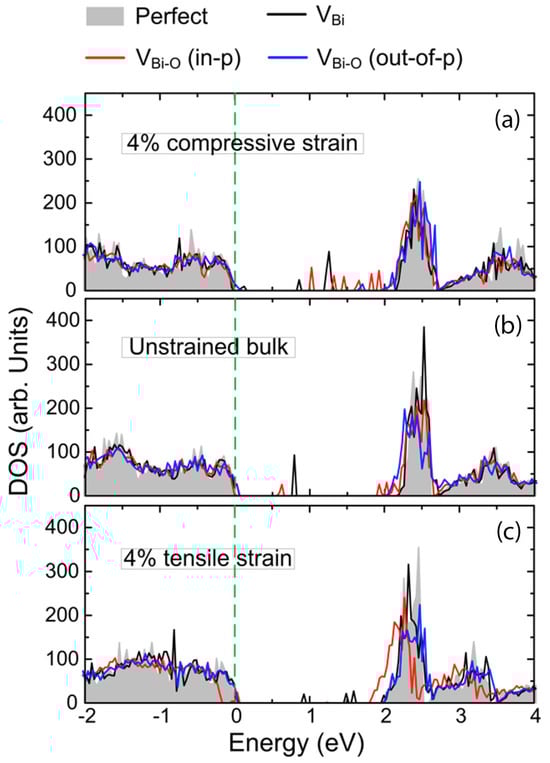 Figure 4. Total DOS of stoichiometric BFO, BFO with one Bi vacancy, and with in-plane and out-of-plane Bi-O vacancy pairs under (a) 4% compressive strain, (b) zero strain and (c) 4% tensile strain, respectively.