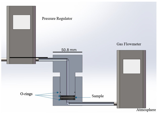 Schematic of in-house-made gas permeability measuring fixture. The fixture is made of two machined aluminum pieces with gas flow channels to clamp the substrate between two rubber O-rings, which prevents side gas leaks. Compressed air flow through the sample is measured as a function of pressure difference controlled by a pressure regulator.