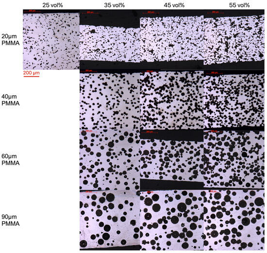 Cross-sectional images of all substrates are shown in Figure 5. When using PF20 as the pore former, the porosity is isolated, with some granularity at 25% pore former content; as the volume fraction increases, the pore becomes irregular and starts to form a more connected porosity network. The small porosity and steel fingers observed in conventional metal supports start to be more observable as the performer content increases. When using PF40, PF60, and PF90 as the pore former, the individual spherical pores are visible at 35%, and as the pore-former size increases, the pores are more isolated, since the number of pore former decreases with increased particle size. At 55% pore-former content, all samples start to show small steel fingers, formed at the necking between two spherical pores. As the pore-former size increases, the number of steel fingers decreases, and the size increases. Small porosity is only present at the necking between major pores.