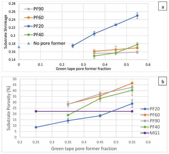 Figure 6a shows the shrinkage of various green tape compositions after sintering at 1200 °C for 4 h. Measuring the shrinkage can be helpful in calculating green body dimensions to achieve the desired sintered part dimension. For PF20, the shrinkage increases linearly as the pore-former fraction increases. The lowest shrinkage is slightly larger than the tape without pore former. For larger pore-former sizes like PF60 and PF90, the shrinkages are relatively consistent regardless of the pore former fraction, and they are all smaller than those without pore former. The PF40 results are similar to those of PF60 but have a more significant shrinkage increment with the pore-former volume fraction. The data on higher pore-former contents were not included because the tape becomes very fragile after the binder has been removed.
