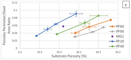 Substrate shrinkage (a) and final porosity (b) with various pore former sizes and volume fractions. The substrate-porosity-perimeter-to-steel-area ratio and corresponding porosity for all pore-former fractions are shown in (c).