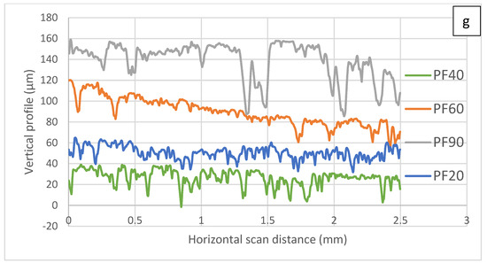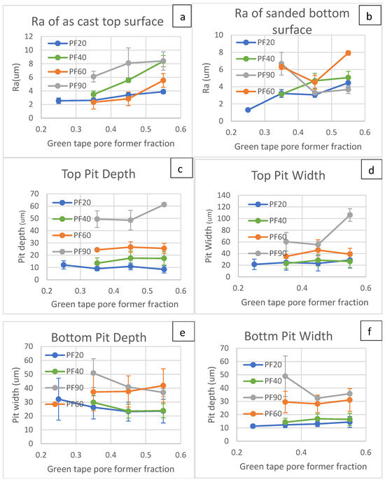 For the top surface, the Ra of PF60 is about the same as or larger than that of PF20 but smaller than PF40, while PF90 has the highest Ra. The Ra values of the bottom surface do not show a clear relationship to the pore-former fractions for those sanded samples. The greater Ra of PF40 than PF60 can be explained by the larger number of PF40 particles for the same volume fraction, making the Ra higher. The average pit depth and width of the top surface increase as the pore former size increases. However, for the bottom surface, such a relation is not clear, especially for the surface roughness and pit depth, possibly because by sanding the bottom side, it is hard to control tapes to have the material evenly removed. When deciding whether there was sufficient sanding, visual inspection was used to see if there were sufficient PMMA beads exposed. Also, sandpaper is filled with removed powder that can make local roughness different compared to areas sanded by fresh sandpaper. The P220 sandpaper has a nominal size of 53 µm, which explains the PF90’s 35% higher values in Figure 7e,f. Nevertheless, pit width and depth are still in the acceptable range when up to 45 vol% pore former is used.