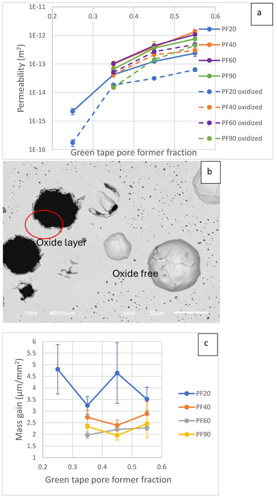 (a) Substrate gas permeability before and after oxidation test. (b) Backscattered electron image of oxidized 35% PF90 substrate, showing oxide-free closed porosity. (c) Normalized mass gain per area with respect to pore former size and fractions.