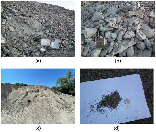 Construction and demolition wastes: (a,b) accumulation of construction wastes before the mechanical treatment; (c) pile of RS after the crushing and sieving processes; (d) particular of a RS specimen and its relative size.