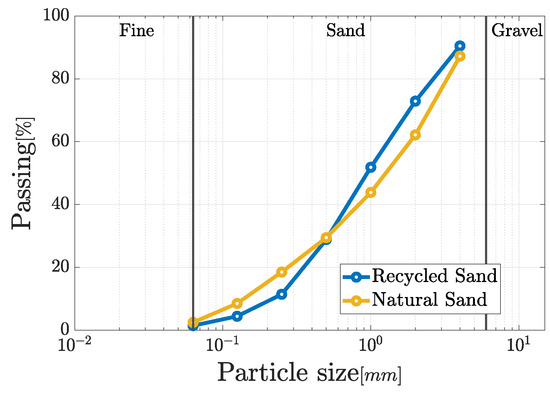 The mechanical treatment used to obtain the RS provides recycled constituents characterized by a peculiar grain size distribution. In the current work, a particle range of 0–6 mm is considered to match the one that defines the NS which can be typically acquired for the preparation of mortars. In this context, the grain size distribution of the two types of sand are shown in Figure 2. The examination of the figure reveals that both types of aggregates exhibit qualitatively similar grain size distributions, proving that RS could replace NS.