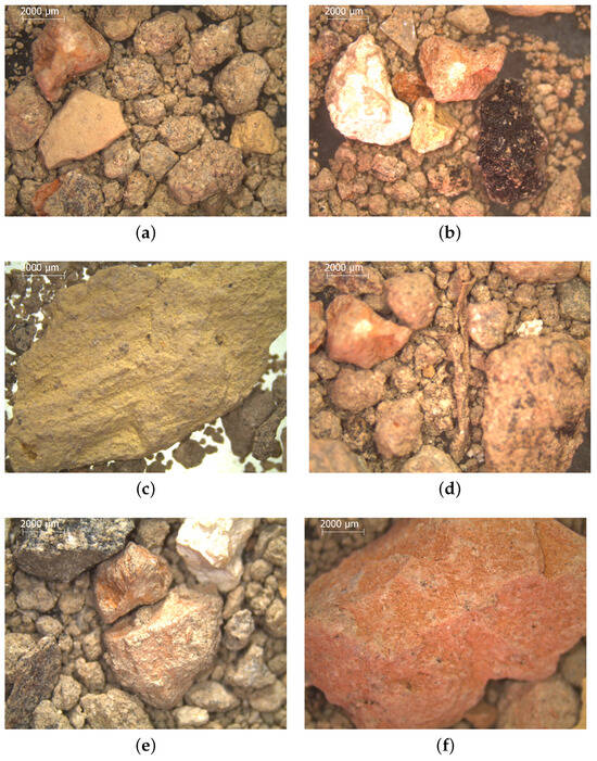 Results provided by the optical microscopy analysis: (a) concrete waste; (b) concrete and asphalt wastes; (c) clay or mudbrick fragment; (d) particular of a wooden piece surrounded by other rocky aggregates; (e) concrete and clay fragments; (f) red ceramic waste.
