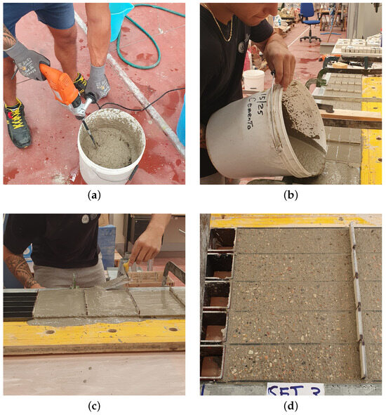Once the mixtures are properly defined following the volume ratio in Table 4, the constituents are mixed together by an electric mixer in a dry state condition; the water is added when the mix achieves a good level of homogenization. As soon as the mixture reaches the desired state, it is poured into prismatic molds measuring mm3. The procedure for the specimen casting is shown in Figure 6 for the sake of clarity.