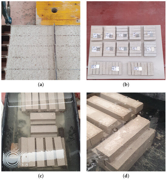 Specimen curing: (a) dry mortar after 2 days of curing in the mould; (b) specimens in air curing condition; (c,d) specimens under water curing conditions.
