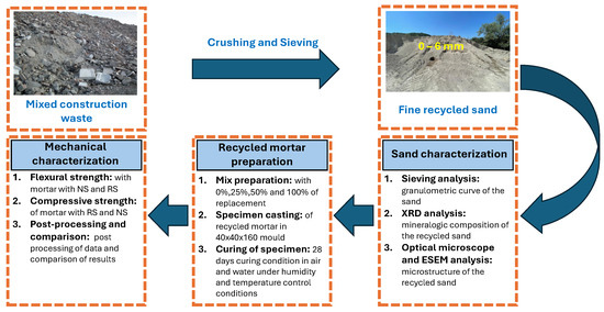 Flowchart of the experimental procedure from the construction wastes to the mechanical characterization of sustainable mortars.