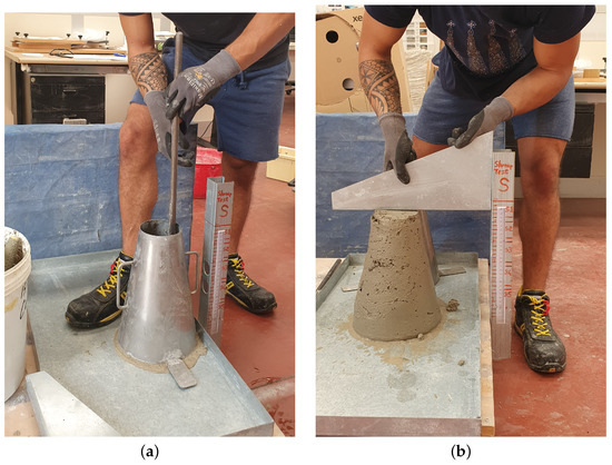 The consistency of the mortar is determined by measuring the slump of the Abrams cone, according to the standard defined in [35]. The fresh mortar is poured in three different layers, each corresponding to one-third of the total height of a steel mold shaped like a truncated cone. Each layer of fresh mortar is compacted with 25 strokes using a tamping rod. The strokes are distributed in a spiral pattern, moving from the perimeter of the mold towards the center. After compacting the final layer, the mold is removed, and the slump is measured immediately without interruption. The higher the slump is, the lower the consistency of the sample and the higher the workability are. The compaction and the measurement phases of the test are depicted in Figure 9.