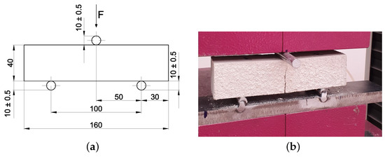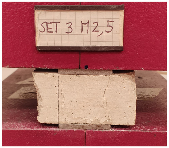 A three-point bending test is first carried out to assess the flexural strength of the mortar. The well-known static scheme of the test is presented in [34], and it is shown in Figure 10 for completeness purposes together with the representation of the failure state of the specimen on the testing machine once the procedure is accomplished. The specimens are subjected to a concentrated force in the middle of the sample. This force is increased with a load rate of 0.05 KN/m according to the standard until the specimen reaches failure.