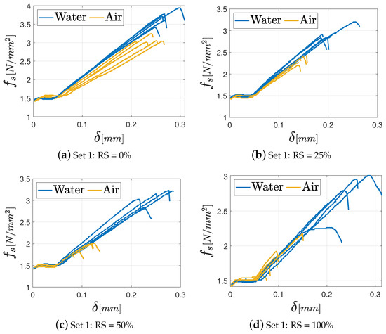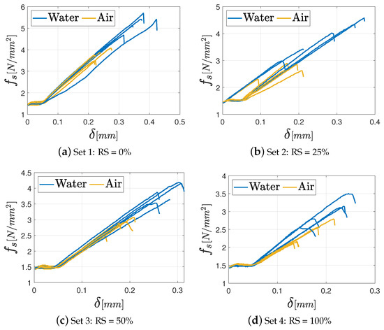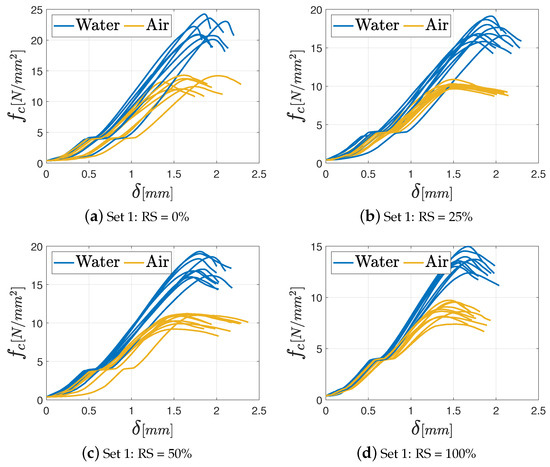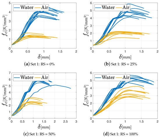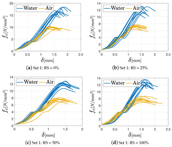 In general, all the specimens exhibit an initial settling phase due to aggregate interlocking followed by a linear elastic phase until the maximum load is attained. In fact, once the maximum load is reached, no further strength contribution is observed in brittle materials, and the force drops quickly after that point because of the opening of a central fracture in the specimen. Regardless of the percentage of the RS in the mixture, the M8 mortar achieves the best performance under both air and water curing conditions. This outcome is closely tied to the higher amount of binder in the mix. In addition, some differences in terms of maximum strength between specimens cured in air and those cured in water can be observed. In particular, specimens cured in water yield the best results in terms of mechanical performance, especially as far as the M8 mortar is concerned. This observation is coherent with the findings presented in previous studies [36,37], which relate the superior performance under water-curing conditions to the absence of water loss during the curing process. Consequently, the formation of hydrated calcium silicate, which has the main role in the development of concrete and mortar strength, is optimized.