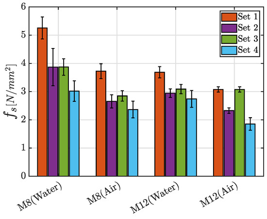 A general and significant difference in terms of flexural strength can be observed by means of the comparison of the mortars with RS or NS. In fact, the use of recycled aggregates, independently from their percentages, entails a weakening of the properties if compared to the ones which characterize the Set 1 that has no RS in the mixture. This aspect is particularly evident in the M8 mortars cured in water, where a decrease about is noted between Set 1 and Set 4. The other cases are characterized by a percentage difference in the range 35–55%. These considerations can be easily deduced from the bar graphs in Figure 14, where the mean values of the maximum flexural strength for each class of mortar with the corresponding standard deviation, grouped by the adopted curing process, are presented.