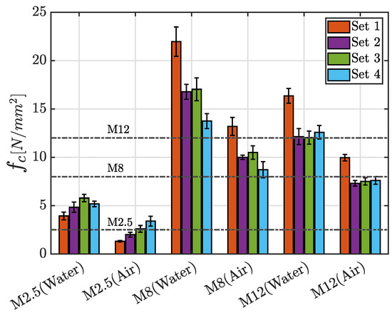 In the graph shown in Figure 18, the dashed black line represents the minimum strength requirement defined by regulations for a mortar of a given class to be deemed suitable for structural applications [33]. It is evident that both M2.5 and M12 mortar mixes, when cured in air, fail to meet the minimum strength threshold fixed by the standard, while the other mixes follow the specified limits. No issues in this context are observable when the specimens are cured in water.
