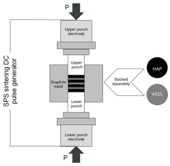 Powders of corresponding quality were put into the graphite die layer by layer in a certain order (Figure 1). The masses of the HAP layer and the 45S5 bioglass layer used to produce the samples were 1 g and 0.5 g, respectively. The corresponding two powders were sequentially loaded into a graphite mold with an inner diameter of 20 mm. For each layer added, an axial pressure of 20 MPa was exerted on the material via a graphite indenter to ensure that the contact surfaces between the layers remained flat. The inner wall of the graphite mold and the pressure head were separated from the powder using graphite paper with a thickness of 0.2 mm to facilitate easy demolding. The preform was consolidated using SPS equipment (SPS. Dr Sinter 1050, Sumitomo Coal Mining Co., Ltd., Tokyo, Japan). A schematic diagram illustrating the raw material filling and sintering process for the HAP/45S5 bioactive glass laminated composites is presented in Figure 1. The SPS temperature range for the layered composite materials was established to be between 850 °C and 1050 °C, with an experimental point taken at every 50 °C interval. The experimental sintering parameters are shown in Table 1.