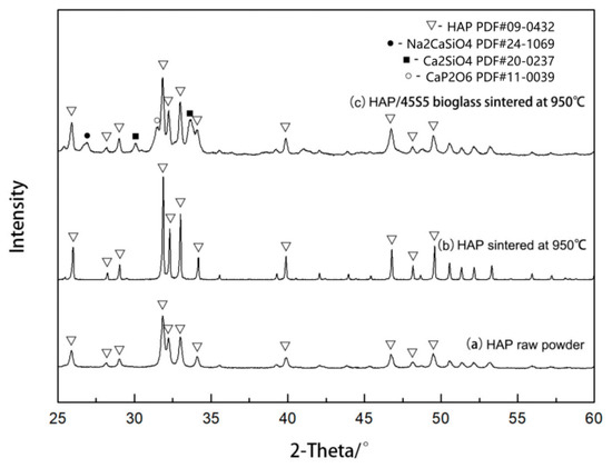 The X-ray diffraction results of the original HAP powder, the pure HAP powder sintered at 950 °C, and the layered composite material of the HAP/45S5 bioglass sintered at the same temperature are compared in Figure 7. From the comparison results, it was evident that, compared to the layered composite material sintered at 950 °C, the pure HAP sintered body exhibited a narrow and sharp peak, indicating that the presence of the 45S5 bioglass layer inhibited the growth of HAP grains [52]. From Figure 8, it is evident that under identical sintering conditions of 950 °C, the grains of the pure HAP sintered body started to grow rapidly along the c-axis, forming needle-shaped and columnar crystals. In contrast, the majority of HAP grains within the sintered body of the HAP/45S5 bioglass layered composite material remained spherical, with a particle size of approximately 1 μm. Only in the region adjacent to the 45S5 bioglass layer did the HAP grains develop into particles with a diameter of approximately 2 μm, preserving a spherical morphology.