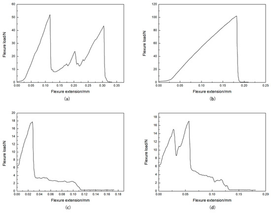 Load-displacement curves of the HAP/45S5 bioglass laminated ceramics at different sintering temperatures: (a) 900 °C; (b) 950 °C; (c) 1000 °C; and (d) 1050 °C.
