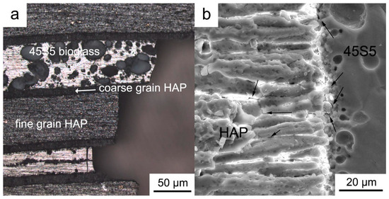 Based on the side profile of the fracture of the HAP/45S5 laminated composite bending specimen depicted in Figure 10a, the crack propagation path within the specimen was observed. Interlayer cracks mainly occurred at the interface between the 45S5 bioglass and the HAP coarse-grained layer, indicating that the bonding strength between the layers of 45S5 bioglass and HAP coarse grains was insufficient, making cracks more likely to propagate along these weak areas. At the same time, during the propagation process, cracks frequently encountered obstacles at the layer interface, leading to deflection or passivation. This made it challenging for the crack tip to advance smoothly along the propagation direction, thereby enhancing the toughness of the ceramic materials [53]. Cracks deflected along grain boundaries after extending into the layers from the interfaces, rendering grain boundaries the primary pathway for crack propagation. In regions where the HAP grains were relatively coarse, some cracks no longer propagated solely along grain boundaries, instead exhibiting transgranular fracture phenomena. Transgranular fracture refers to a crack that passes directly through the interior of a grain, rather than propagating along the boundaries between grains. This type of fracture typically occurs in materials with larger grain sizes and internal stress concentrations. It indicates that the material has poor toughness in these areas and is prone to brittle fracture. In Figure 10b, the cracks in the material are indicated by arrows.