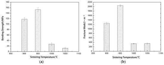 Table 2 presents the average values and standard deviations of flexural strength and fracture work for HAP/45S5 bioglass composites. Figure 11 illustrates results regarding the flexural strength and fracture work of HAP/45S5 bioactive glass laminated composites across various temperatures. As can be seen from Figure 11, the bending strength and fracture work of the sintered body were both highest at 950 °C, being (153.22 ± 7.7) MPa and (2049 ± 34) J·m−2, respectively, which corresponds to the load-displacement curves. An increase in fracture toughness can be influenced by several factors: ① deflection of the crack path during crack propagation; ② pinning effect of local compressive stress fields produced by secondary phases on crack growth; ③ bridge action of indehiscent ligaments on cracks (fiber enhancement); ④ energy absorption via the appearance of microcracks around the main crack; and ⑤ squeezing of the crack surfaces, which means that phase transformation expansion [54] requires more energy for cracking to proceed.