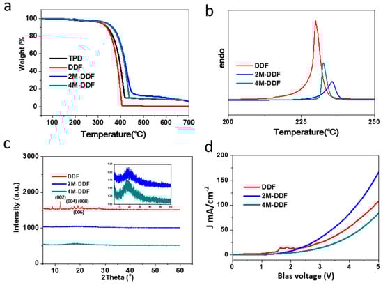 TGA (a), DSC (b), XRD (c), and SCLC (d) curves of DDF, 2M-DDF, and 4M-DDF. The space charge limited current (SCLC) of hole-only devices with the configuration of indium tin oxide (ITO)/poly(3,4-ethylenedioxythiophene)–polystyrene sulfonate (PEDOT:PSS)/DDF (red), 2M-DDF (blue), 4M-DDF (cyan)/Au.