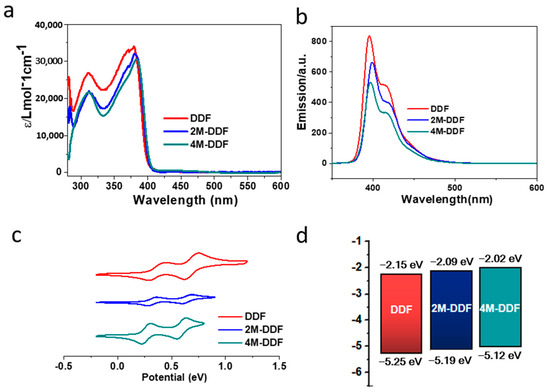 UV–vis absorption spectra (a) and fluorescence spectra (b) of DDF, 2M-DDF, and 4M-DDF in toluene (excitation wavelength: λmax of absorption; concentration: 5 × 10−6 mol L−1). The UV–vis absorption and fluorescence were measured at room temperature. (c) Electrochemical curves of DDF, 2M-DDF, and 4M-DDF in dichloromethane vs. Ag/Ag+, with the concentration of 5 × 10−3 mol L−1 and orbital energy levels of those determined (d). The HOMO energy was deduced from the oxidation onset potential and calculated by the equation: EHOMO = −Eonset − 4.93 (eV), ELUMO = EHOMO + Egop. The optical band gap (Egop) was calculated using Tauc’s relation in toluene [43,44].