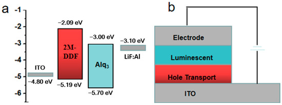 Figure 2 shows the frontier orbitals of the arylamines calculated using density functional theory (DFT) at the B3LYP/6-31G(d) level. Introducing the fluorene group and adjusting the end groups largely affected the energy level of the compound. The HOMO energy levels of DDF, 2M-DDF, and 4M-DDF were −4.99, −4.69, and −4.62 eV, respectively. The LUMO energy levels of DDF, 2M-DDF, and 4M-DDF were −1.29, −0.99, and −0.95 eV, respectively, indicating that the energy level can be adjusted by changing the molecular structure. Figure 3a depicts the UV–vis absorption and fluorescence (FL) spectra of DDF, 2M-DDF, and 4M-DDF in toluene solution (5 × 10−6 M). The spectra of all compounds show a strong absorption peak around 380–400 nm assignable to n–π* transitions of the fluorene core [43]. From the onset of absorption, the optical band gap Eg was calculated as 3.10 eV for DDF, 2M-DDF, and 4M-DDF. The fluorescence maxima of the fluorene-based compounds appeared at 410 nm (Figure 3b). Figure 3c shows the electrochemical measurements (CV curves) of DDF, 2M-DDF, and 4M-DDF. From the onset potentials of oxidation, the HOMO energy levels of DDF, 2M-DDF, and 4M-DDF were estimated as −5.25, −5.19, and −5.12 eV, respectively. Note that all fluorine-based compounds exhibited shallower HOMO energies than TPD (−5.50 eV) [16,17]. The HOMO energies of 2M-DDF (−5.19 eV) and 4M-DDF (−5.12 eV) approached the work function energy of indium tin oxide (ITO) (−4.80 eV), implying smaller hole-injection barriers from ITO to 2M-DDF and 4M-DDF (0.39 and 0.32 eV, respectively) than from ITO to TPD [16,17]. The reduced injection barrier of holes is conducive to hole injection. From the HOMO energy levels and Egop, the lowest unoccupied molecular orbital (LUMO) energy levels of DDF, 2M-DDF, and 4M-DDF were calculated as −2.15, −2.09, and −2.02 eV, respectively. The low LUMO energies of 2M-DDF and 4M-DDF indicate that these materials can prevent electron leakage from the emissive layer into the hole-transport layer. Judging from the energy levels, all compounds are suitable hole-transport materials for optoelectronic devices. 2M-DDF and 4M-DDF with higher HOMO energies are especially expected to improve the carrier-transport performance.